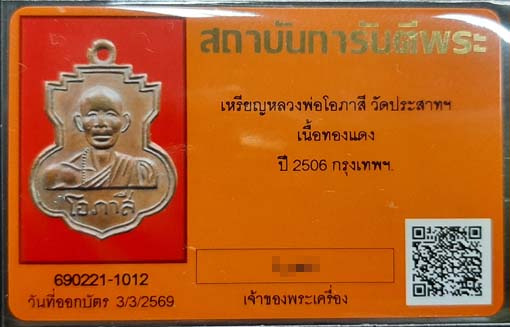 เหรียญหลวงพ่อโอภาสี วัดประสาทฯ เนื้อทองแดง ปี2506 พร้อมบัตรรับรองครับ