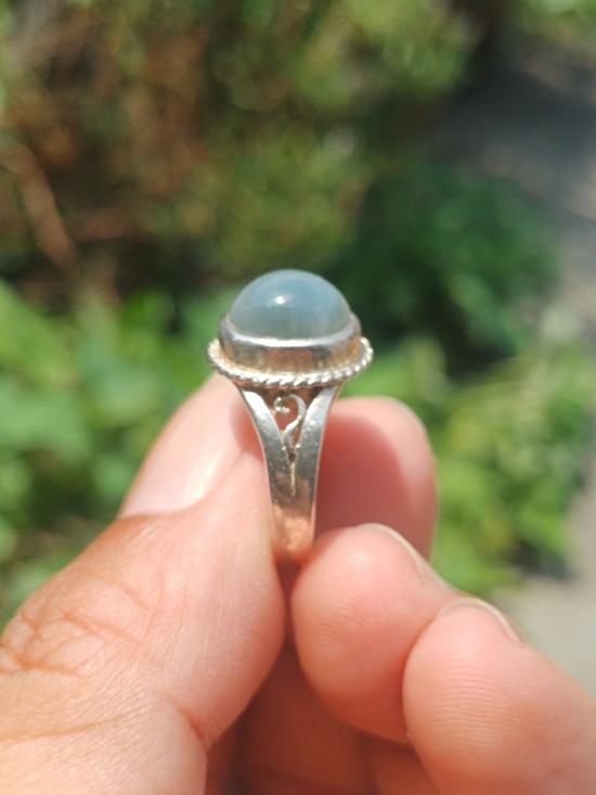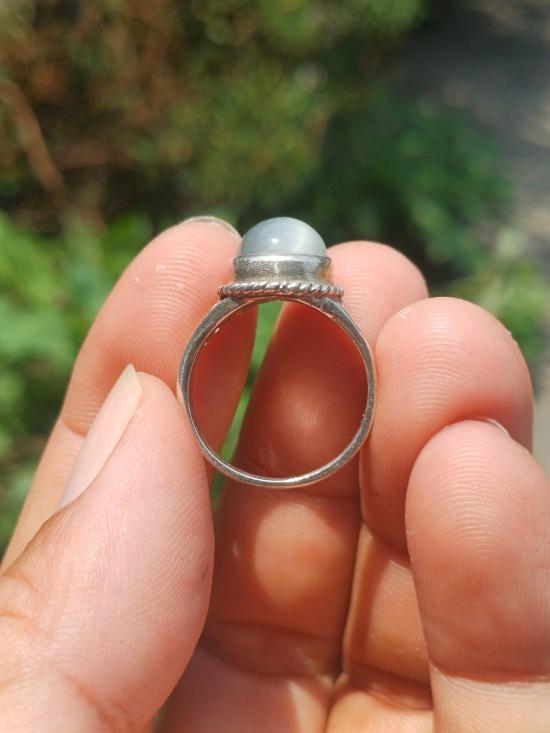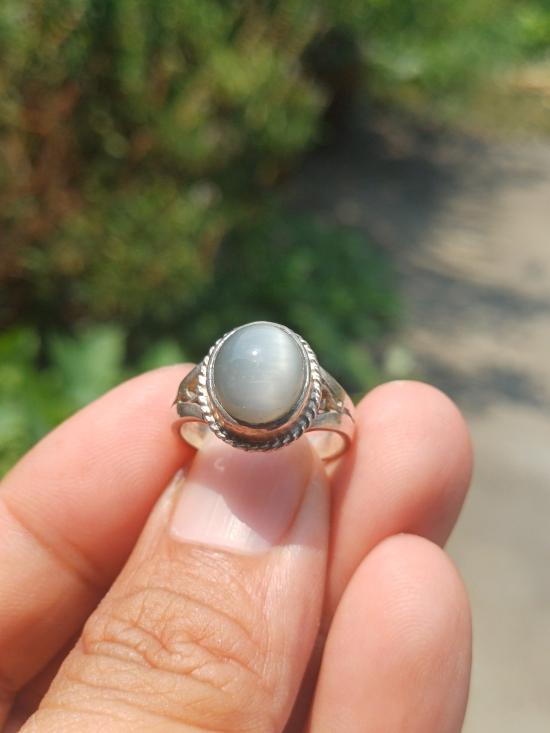 แหวนเงินแท้ไม่ทราบชนิดพลอยครับ แต่เป็นพลอยแท้ธรรมชาติพอโดนแสงจะเกิดเส้นสะท้อนเหมือนตาแมวครับ ไซค์54 |