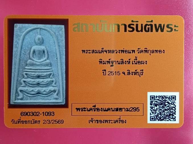 พระสมเด็จฐานสิงห์ อนุสรณ์จากพระมหาวิหารพระเขี้ยวแก้ว(พระทันตธาตุ) ประเทศศรีลังกา หลวงพ่อแพ วัดพิกุลทอง ปลุกเสกเดี่ยวตลอดไตรมาส พ.ศ.๒๕๑๕ จัดพิธีพุทธาภิเษกใหญ่ในวันเสาร์ที่ ๒๑ ตุลาคม ๒๕๑๕ ตรงกับวันขึ้น ๑๔ ค่ำ เดือน ๑๑ ปี ชวด อนุสรณ์จากเมืองแคนดี้ สาธารณรัฐศรีลังกา ในวาระที่หลวงพ่อแพท่านได้นำคณะศรัทธาญาติโยมศิษยานุศิษย์เดินทางจาริกแสวงบุญไปนมัสการพระทันตธาตุ-พระเขี้ยวแก้วของสมเด็จพระบรมศาสดาสัมมาสัมพุทธเจ้า มาพร้อมบัตรรับรองจากสถาบันการันตีพระค่ะ