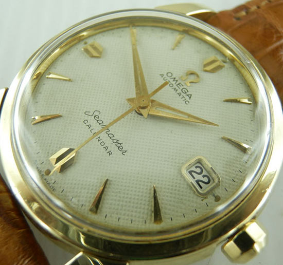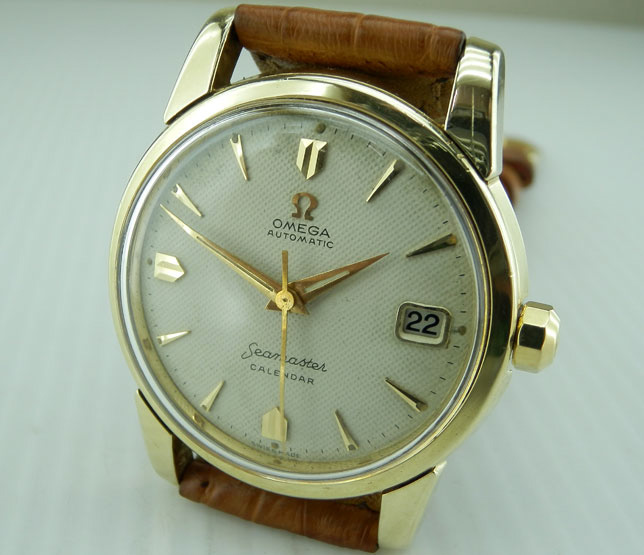 Omega Automatic Seamaster Calendar โอเมก้า ออโตเมติค ซีมาสเตอร์ คาเลนดาร์ ตัวเรือนหุ้มทอง14K. ฝาหลังสเตนเลส ขนาด 34 มม.(วัดขนาดโดยไม่รวมเม็ดมะยม) ระะบบออโตเมติค เครื่องเบอร์ 503 ทับทิม 20 เม็ด จักกรอกทำงาน 19800 รอบ/ชั่วโมง พลังงานสำรอง 46 ชั่วโมง swiss made ปี 1957 อายุ 54 ปี หน้าปัดเดิมลายผ้ามีวันที่ เข็มเดิมทรงดาบทอง หลักชั่วโมงทองสวย เม็ดสวยแท้ เดินตรงดีไม่มีงอแง ตรวจเช็คแล้วโดยช่างผู้ชำนาญงานและอุปกรณ์ที่ทันสมัยครับ**พร้อมสายหนังครับ..
