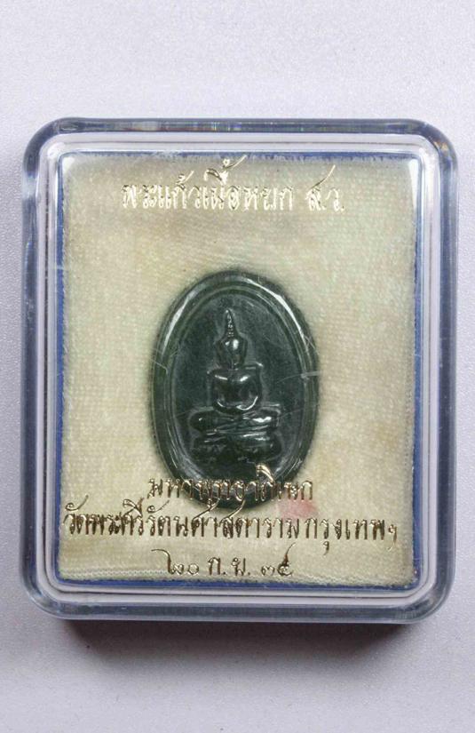 พระแก้วหยกวัดพระแก้วเชียงราย ปี34 รูปไข่ สร้างในวโรกาศเนื่องในมหามงคลวโรกาสที่ สมเด็จพระศรีนครินทราบรมราชชนนี ทรงเจริญพระชนมายุครบ ๙๐ พระชันษา วันที่ ๒๑ ตุลาคม พ.ศ.๒๕๓๓ สวยนอนกล่องเดิมๆๆ