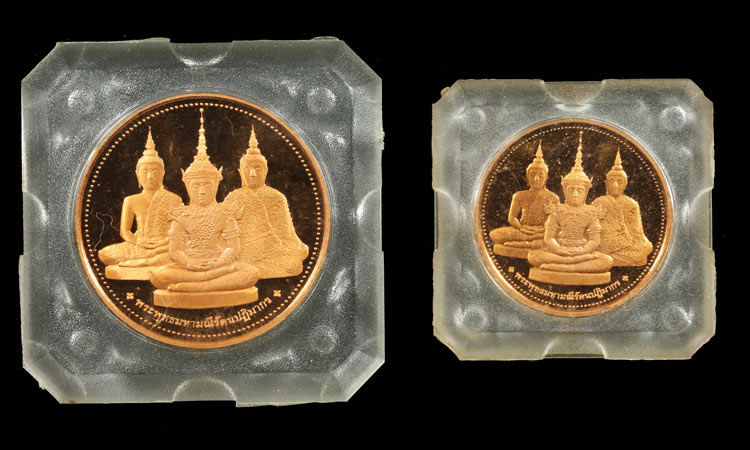 เหรียญพระแก้วมรกต ๓ ฤดู ทองแดงขัดเงา ขนาด 3.2, 2.5 ซม.พระจอมเกล้าพระนครเหนือ กล่องเดิม