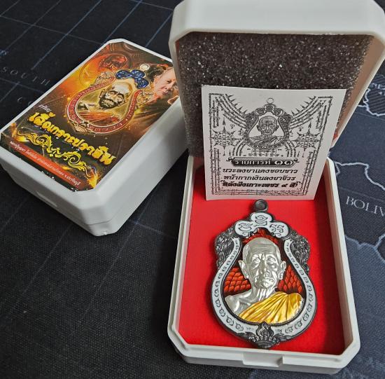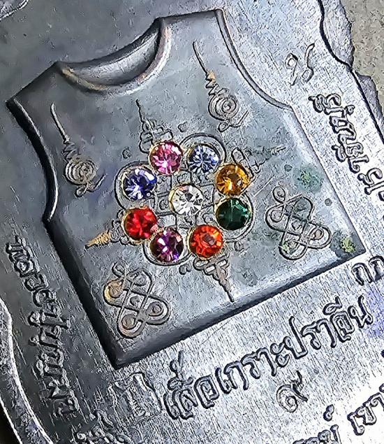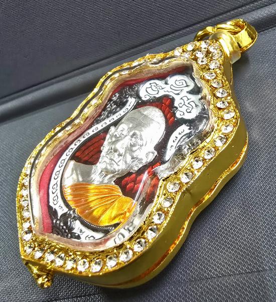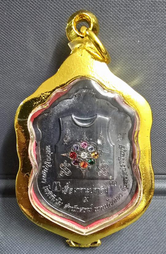 เนื้อนวะโลหะ ลงยาแดง ขอบขาว หน้ากากเงิน ลงยาจีวร หลังฝังเกราะเพชร ๙ สี (ใส่ตลับชุบทองฝังเพชรสวยๆให้ด้วยครับ)