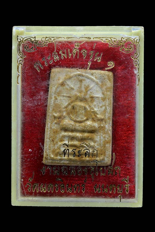 พระสมเด็จเล็ก พิมพ์เส้นด้าย ( เนื้อผงสีขาว ) ที่ระลึกงานฉลองอุโบสถ วัดนครอินทร์ จ.นนทบุรี ปลุกเสกโดย หลวงพ่อคูณ พ.ศ.2527 ( กล่องเดิม ) จัดสร้าง 200 องค์