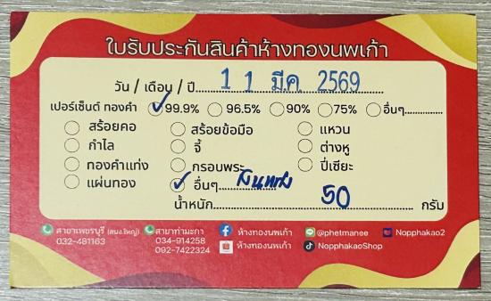 เงินแท่ง 999.9% หนัก 50 กรัม ประมาณ 3 บาท นิดๆ พร้อมบัตรร้านตัวแทน