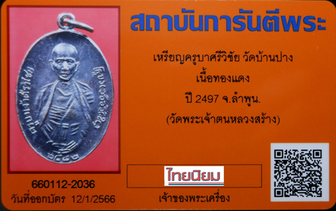 เหรียญครูบาเจ้าศรีวิชัย วัดบ้านปาง ปี2497 (บล๊อคตากลม นิยม) วัดพระเจ้าตนหลวงสร้าง เหรียญยุคเก่าแดนล้านนา สวยเดิม + บัตรรับรอง G-PRA