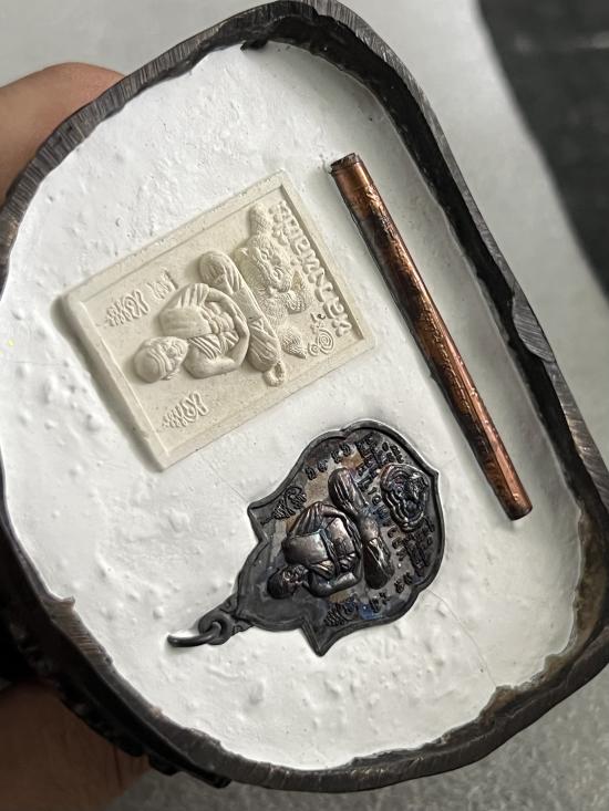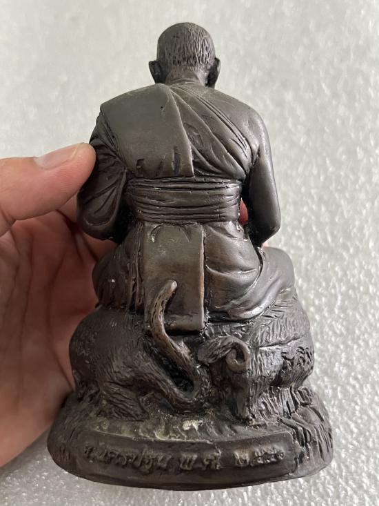 หลวงพ่อเปิ่นนั่งเสือ+หมูป่า ฐาน3นิ้ว เนื้อโลหะใต้ฐานฝังเหรียญ+พระผงพ่อเปิ่น+ตระกรุด ปี2551