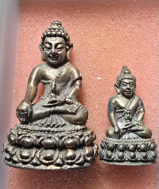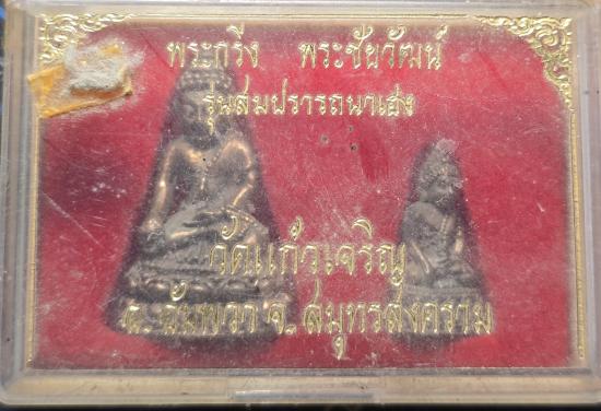 พระกริ่ง + พระชัยวัฒน์ หลวงพ่อหยอด วัดแก้วเจริญ รุ่น สมปรารถนาเฮง ปี2537 สมุทรสงคราม เนื้อนวะ โลหะ กล่องเดิมตอกโค๊ต เคาะเดียวแดง