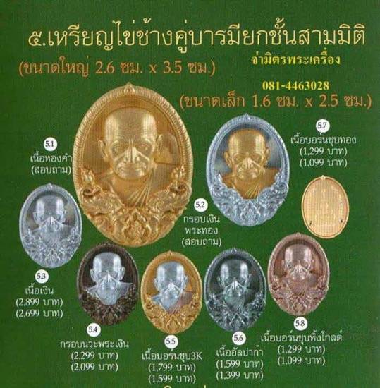 เหรียญไข่ช้างคู่บารมี หลวงพ่อเงิน วัดท้ายน้ำ รุ่นสร้างหลวงพ่อองค์ใหญ่ ปี 56 เนื้อบอร์นชุบ 3 K พิมพ์ใหญ่ กล่องเดิมซีลเดิม ราคาจอง 1,799 บาท ครับ |