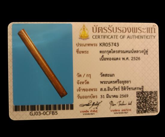 ตะกรุดไตรสรณคมน์ หลวงปู่ดู่ วัดสะแก เนื้อทองแดงยาว 3นิ้ว พร้อมบัตรรับรองสมาคม
