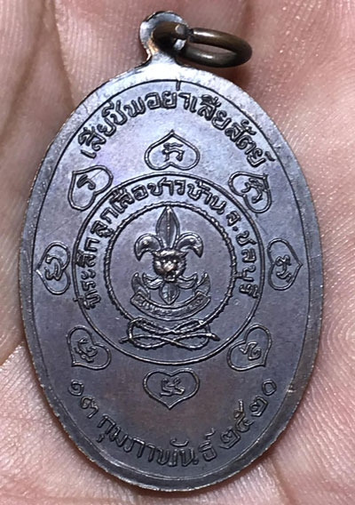 เหรียญหลวงปู่เหมือน (พระครูอุดมวิชชากร) วัดกำแพง จ.ชลบุรี ปี2520 หลังตราลูกเสือ