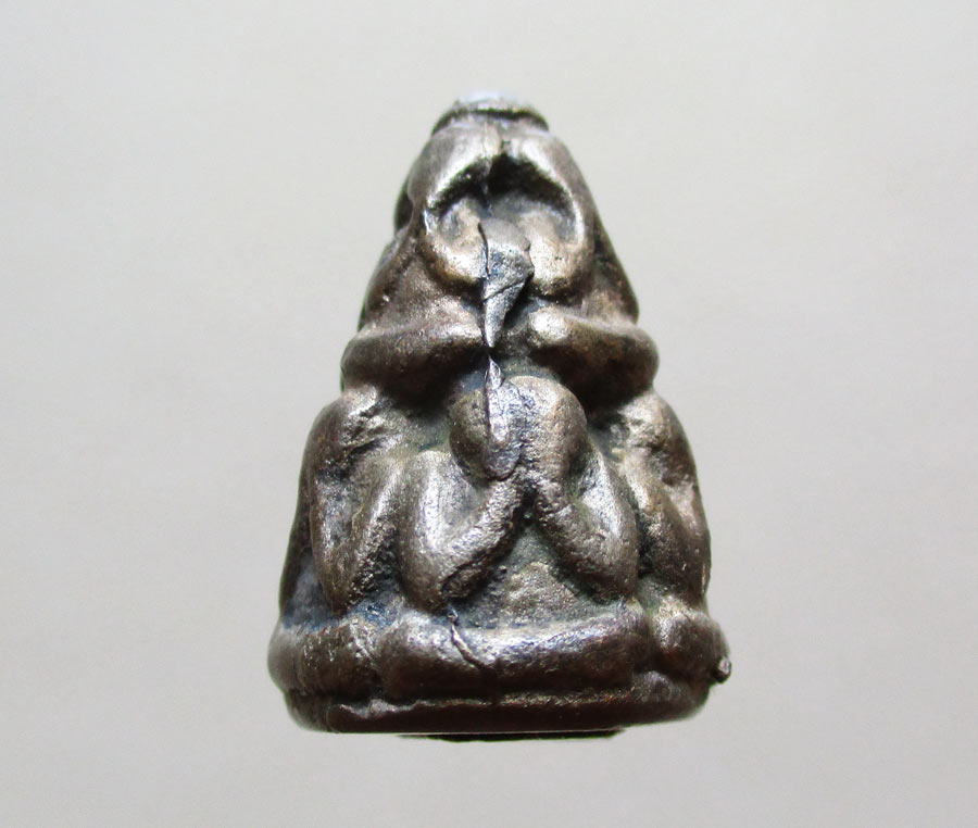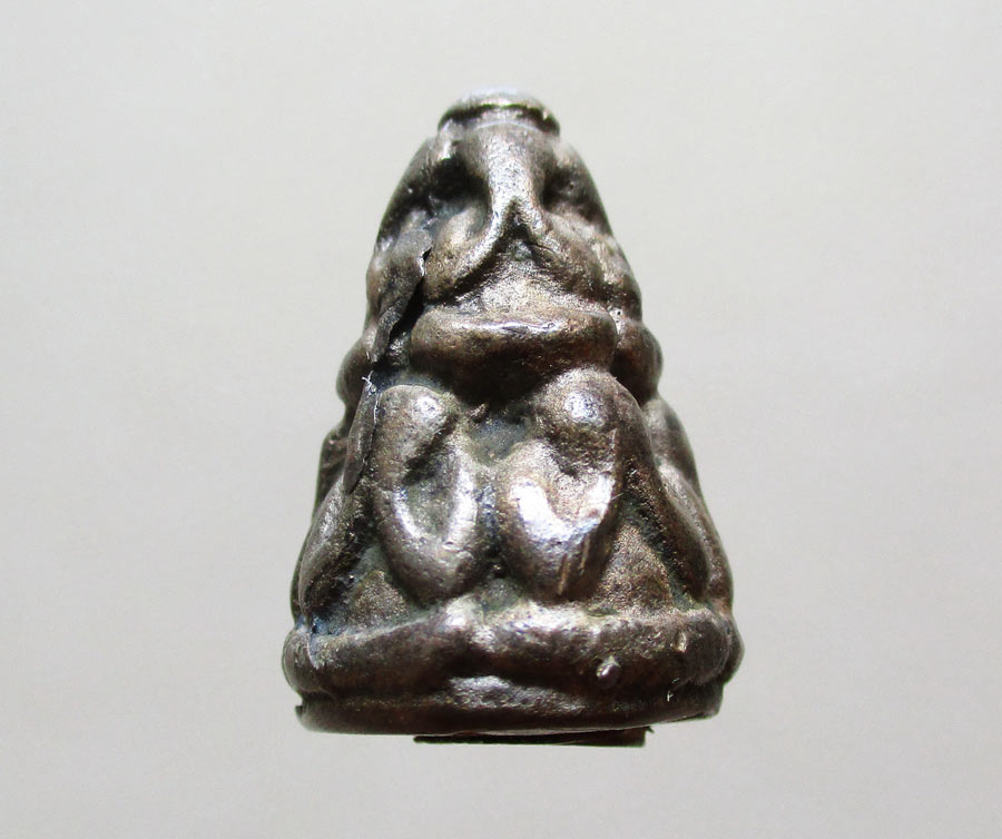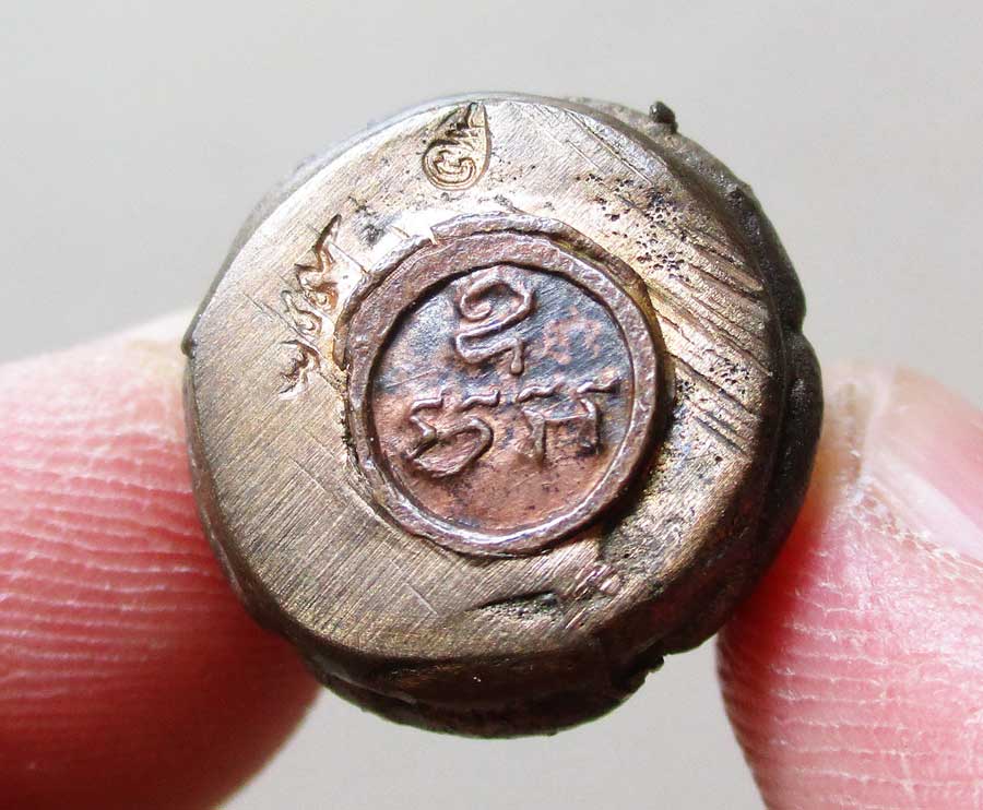 ใต้ฐานบรรจุเม็ดกริ่ง ปิดด้วยแผ่นยันต์ มะ อะ อุ