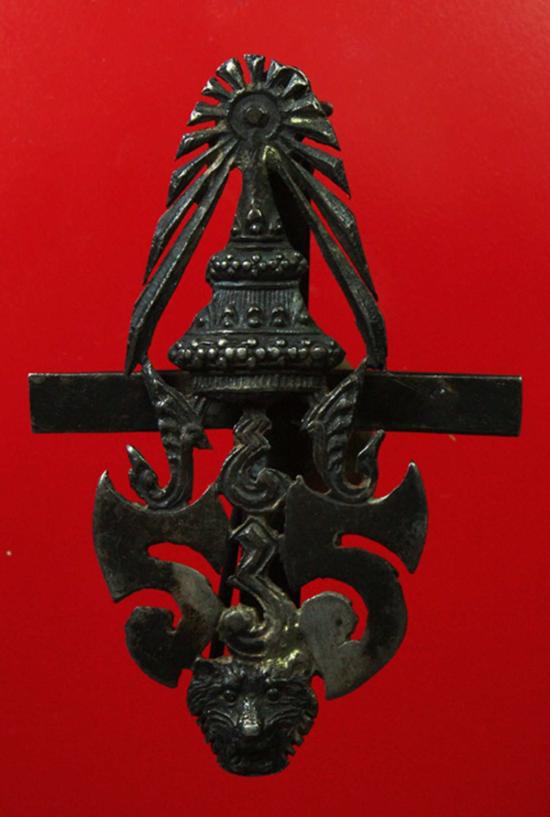 ส่วนยอดเป็นรูปมงกุฎ และส่วนล่างเป็นรูปหัวเสือ