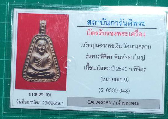 เหรียญหล่อหลวงพ่อเงิน พิมพ์จอบใหญ่ รุ่นพระพิจิตร เนื้อนวะโลหะ ปี 2543 หมายเลข ๙