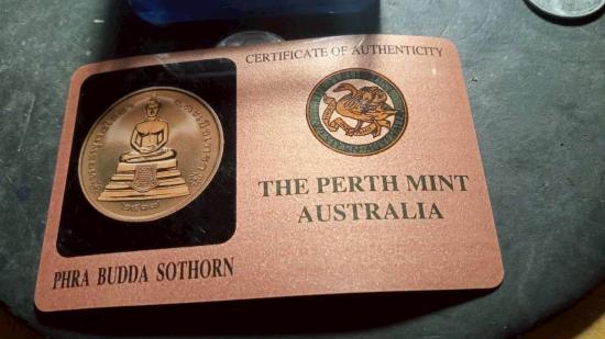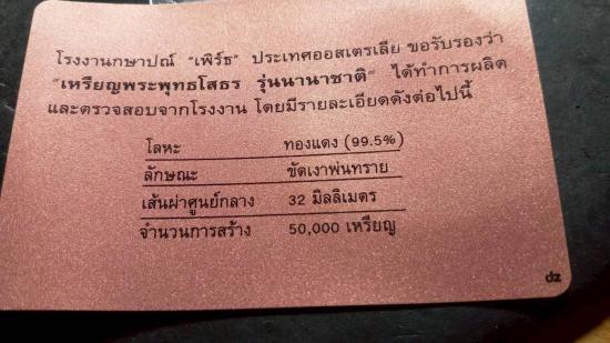 เหรียญหลวงพ่อโสธร รุ่นนานาชาติ เนื้อทองแดงขัดเงาพ่นทราย ไม่ผ่านการใช้งาน พร้อมบัตรรับรอง สภาพเก่าเก็บ จะเห็นรอยกรอบพลาสติกเป็นรอยเมื่อส่องกับแสง