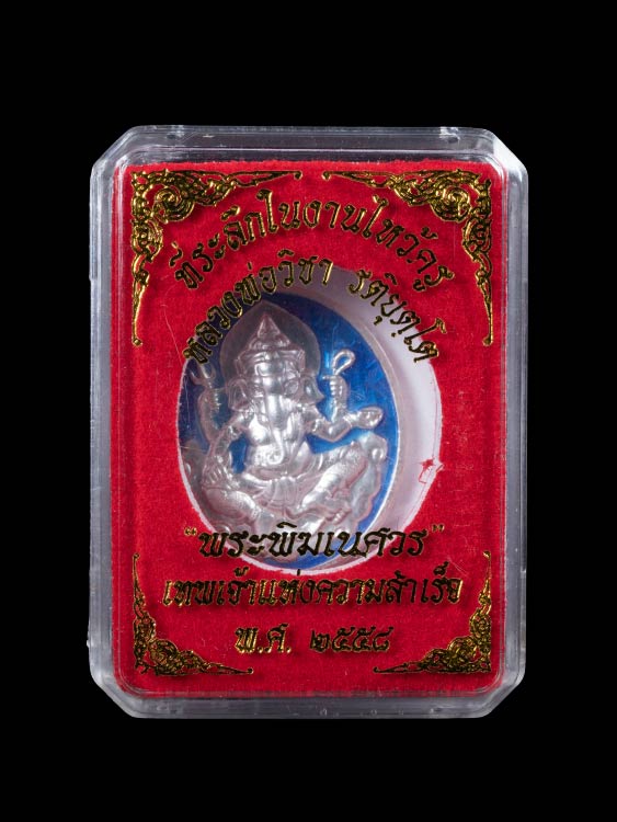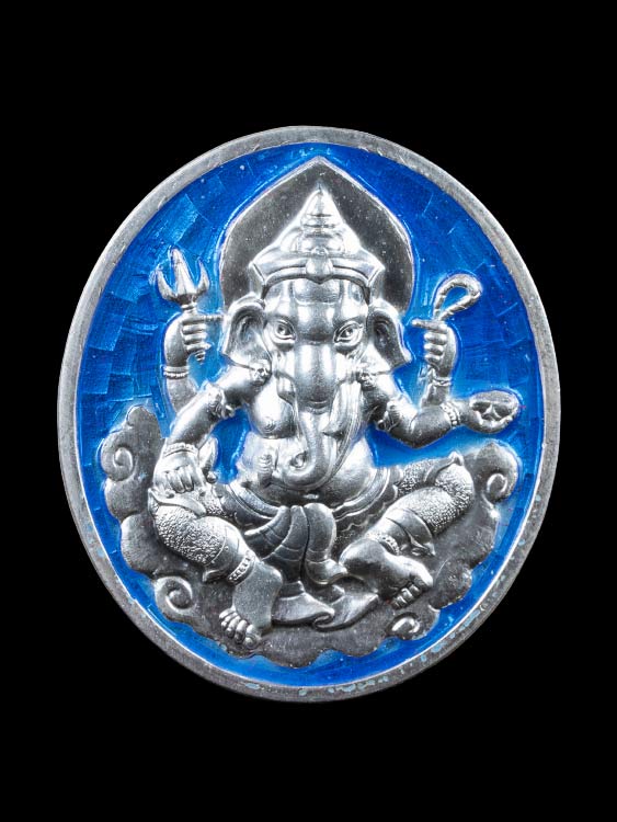 เหรียญพระพิฆเนศวร ที่ระลึกในงานไหว้ครู หลวงพ่อวิชา รติยุตฺโต วัดศรีมณีวรรณ จ.ชัยนาท พ.ศ.2558 เนื้อเงินลงยาสีน้ำเงิน ตอก 2 โค๊ต ตอกเลข สภาพสวยกริ๊บพร้อมกล่องเดิม