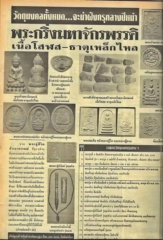 มวลสารต่าง ๆ ที่ใช้สร้างพระสมเด็จนวะโลกุตระธรรม และมวลสารอุดก้นพระกริ่ง พระชัยวัฒน์ มหาจักรพรรดิเนื้อโสฬสมหาจักรพรรดิธาตุเหล็กไหล พระธาตุ 500 อรหันต์ พระธาตุข้าว แก้วขนเหล็ก เพชรหน้าทั่ง เหล็กไหลฤาษี เหล็กไหลเงินยวง เหล็กไหลตาแรด โคตรเหล็กไหลสีเงินยวง ขี้เหล็กไหล เหล็กย้อย เหล็กทรหด หยกพันปี แร่บางไผ่ ผงตะไบเหล็กน้ำพี้ แร่เหล็กน้ำพี้ ไหลเพชรดำ ขมิ้นหินหมื่นปี ข้าวตอกพระร่วง แก่นไม้สักหินอายุ 160 ล้านปี มะพร้าวหินล้านปี ลูกมณีโคตร กะลาตาเดียว กาลาไม่มีตา(กะลามหาอุด) กัลปังหาแดง กัลปังหาดำ ดินโป่ง ดินกลางใจเมือง และน้ำจากศาลหลักเมือง 76 จังหวัด ข้าวสารหิน คดหอย ทรายเสก ผงหลวงปู่คู่วัดสะแก ผงหลวงปู่แหวน ผงหลวงปู่ทิมวัดระหารไร่ แป้งเสกหลวงปู่อยู่วัดไทรโยง ผงว่านยาหลวงพ่อเมี้ยนวัดโพธิ์กบเจา เศษพระหักหลวงพ่อมีวัดมารวิชัย เศษพระหักหลวงปู่คำพันธ์วัดธาตุมหาชัยและวัดต่าง ๆ อีกมากมาย เขากวางคุด น้ำมันมนต์หลวงพ่อเมี้ยนวัดโพธิ์กบเจา ชานหมากเสกหลวงพ่อคำวัดท่าทอง ดินวิเศษสีเหลือง สมุนไพร 300 กว่าชนิด น้ำมนต์ 100 ตุ่ม หลวงปู่หงส์วัดเพชรบุรี ดินวิเศษสีเขียว แร่เงิน แร่ทอง แร่นาค ผงธูป สมเด็จโตวัดระฆัง ผงธูปวัดเกศไชโย ผงธูปหลวงปู่ทวดวัดช้างไห้ ผงธูปหลวงพ่อแช่มวัดท่าฉลอง ผงธูป ล.พ.จรัญวัดอัมพวัน เจ้าแม่ลิ้มกอเนี้ย ผงธูปศาลเจ้าพ่อเสือ ผงธูปวัดเล่งเน่ยยี่ ผงธูปวัดไต่ฮงกง หินพระธาติเขา 300 ยอด พระธาตุสิวลีขาว พระธาตุสิวลีสีทอง พระธาตุแก้ว อุกามณี (สะเก็ดดาว) ไม้กลายเป็นหิน ดอกไม้หิน เพชรน้ำค้าง หินเขี้ยวหนุมาน ขมิ้นขาวเปลือกหอย 75 ล้านปี ไม้งิ้วดำ คดปลวก ลูกธนูคนธรรพ์ แร่ทรายเงิน แร่ทรายทอง ผงงาช้าง งาช้างตายพราย งาช้างกระเด็น งาช้างกระดอน ผงเพชรแท้ เศษพลอยเมืองจันทร์ ผงสร้างพระของหลวงพ่อคูณวัดบ้านไร่ หลวงพ่อแพวัดพิกุลทอง หลวงพ่อเปิ่นวัดบางพระ หลวงพ่อคงวัดบางกระท้อน หลวงปู่นิลวัดครบุรี หลวงพ่อยิดวัดหนองจอก หลวงพ่อเชิญวัดโคกทอง หลวงปู่คำพันธ์วัดธาตุมหาชัย หลวงพ่อเกษม สุสานไตรลักษณ์ และผงสร้างพระของพระอาจารย์ต่าง ๆ อีก 300 กว่ารูป(ซึ่งไม่สามารถลงหมดได้) เศษพระหักของวัดระฆัง เศษพระหักวัดปากน้ำ พระเครื่องเก่าที่ชำรุดอีกเป็นจำนวนมาก ผงตะไบพระกริ่ง เนื้อนวะวัดสุทัศน์ ชานหมากหลวงปู่นิลวัดครบุรี ชานหมากหลวงพ่อเมี้ยนวัดโพธิ์กบเจา แป้งเสกหลวงปู่บุดดา ผงยาจินดามณีหลวงปู่ บุญวัดกลางบางแก้ว ผงยาจินดามณีหลวงปู่เพิ่มวัดกลงบางแก้ว น้ำมันงาเสกหน่วงพ่อคง วัดเขาสมโภชน์ น้ำมันงาเสก แร่บางไผ่ น้ำมันมนต์ไพรดำ น้ำมันม