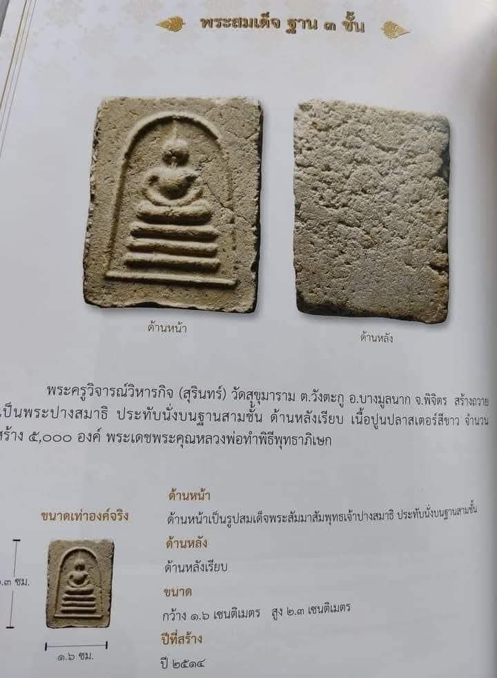 จัดเป็นพระยุคแรกๆ พ.ศ.ลึก ที่หลวงพ่อเมตตาปลุกเสก พระครูวิจารณ์วิหารกิจ (หลวงพ่อสุรินทร์) วัดสุขุมมาราม จ.พิจิตร สร้างถวายหลวงพ่อ จำนวน 5,000องค์ หลวงพ่อทำพิธีพุทธาภิเษก เมื่อปี พ.ศ.2514 พระพิมพ์สมเด็จเป็นพระปางสมาธิ ฐาน 3ชั้น เนื้อผงผสมปูนพลาสเตอร์ |