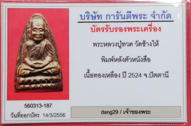 หลวงปู่ทวด พิมพ์หลังตัวหนังสือ เนื้อทองเหลือง ปี 2524 พร้อมบัตรรับรองG-PRA เก็บแบบสบายใจครับ