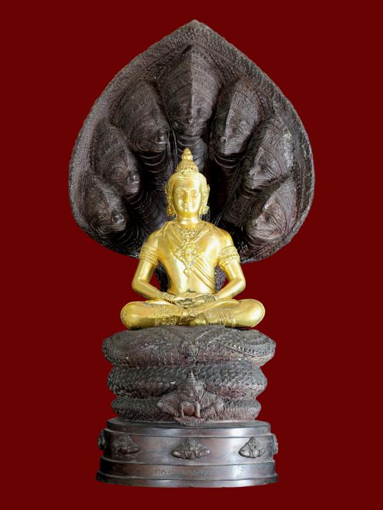 ในด้านพุทธศิลป์ องค์พระบูชาขนาดหน้าตักกว้าง ๑๘ เซนติเมตร และมีความสูงตระหง่านถึง ๕๕ เซนติเมตร สะท้อนความวิจิตรบรรจงเชิงช่างชั้นครู องค์จตุคามรามเทพได้รับการปัดทองอร่ามตา ประทับนั่งอย่างสง่างาม ตัดกับความเข้มขลังของซุ้มปรกพญานาค ๗ เศียรที่แผ่พังพานอยู่เบื้องหลัง รายละเอียดบนลวดลายฐานและเกล็ดพญานาคมีความคมชัดลึก บ่งบอกถึงความตั้งใจในการหล่อหลอมมวลสารและโลหะธาตุอันศักดิ์สิทธิ์