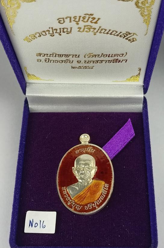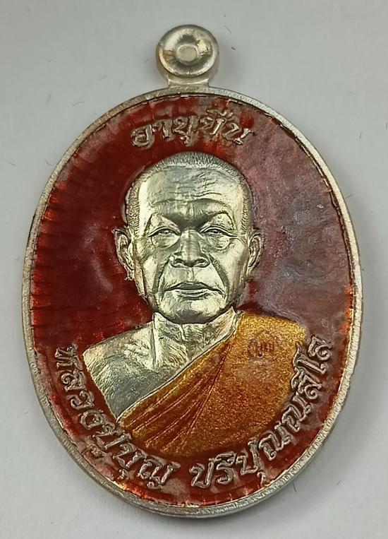 เหรียญอายุยืนบน หลวงปู่บุญ วัดปอแดง ปี58 เนื้อเงินลงยาสีแดง เบอร์ 16 พร้อมกล่องเดิมครับ (เหรียญหนัก13.23 กรัม)