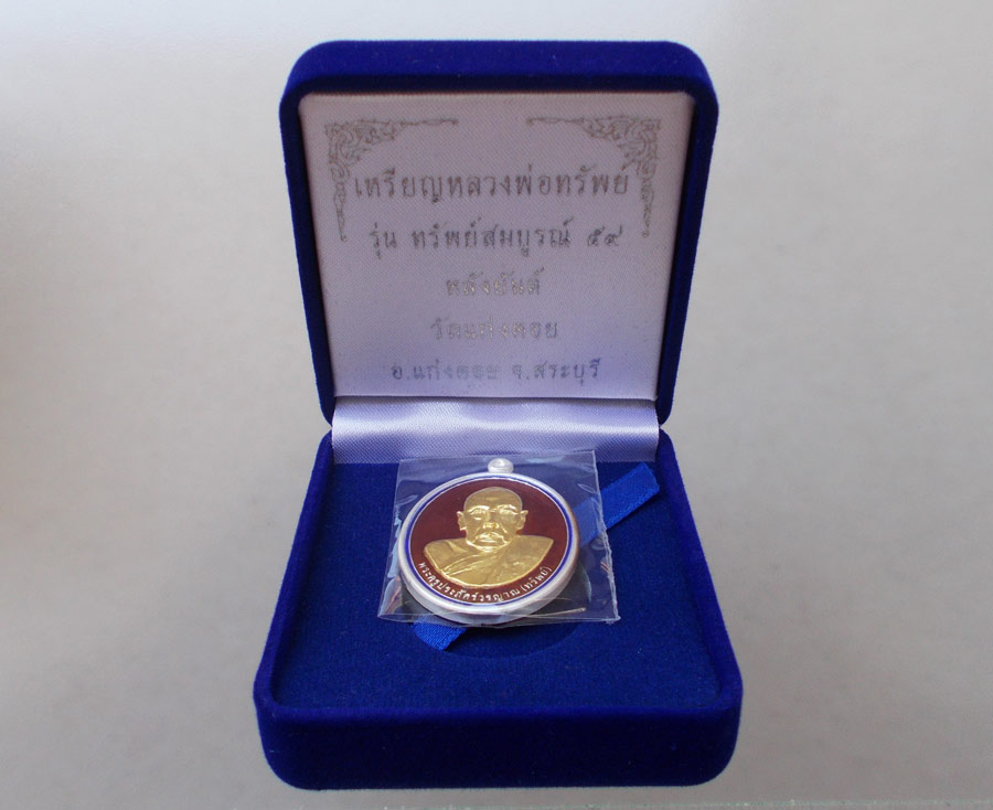 เหรียญพระครูประภัศร์วรญาณ หลวงพ่อทรัพย์ วัดแก่งคอย จ.สระบุรี รุ่นทรัพย์สมบูรณ์ พ.ศ.2559 เนื้อเงินหน้าทองคำ ตอกโค๊ต ตอกเลข สวยสมบูรณ์กล่องกำมะหยี่เดิม !!