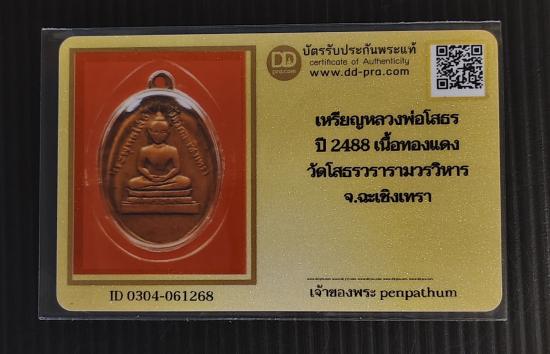 เหรียญหลวงพ่อโสธร ปี 2488 พิมพ์ไม่มีเลข พ.ศ. เนื้อทองแดง + บัตร