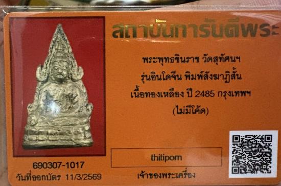 พระพุทธชินราชอินโดจีน สังฆาฏิสั้น ไม่มีโค๊ด วัดสุทัศน์ ปี2485 สภาพสวย ผิวเดิม มาพร้อมบัตรรับรอง