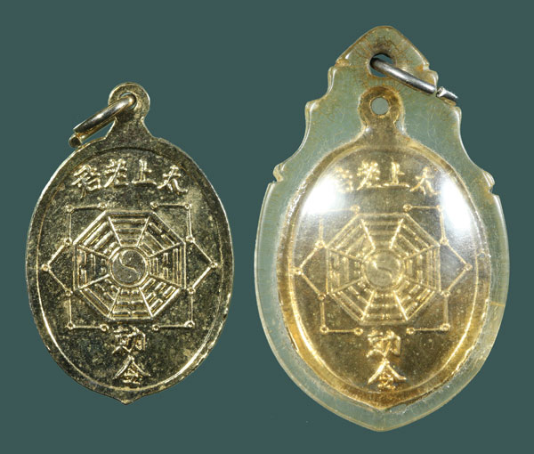 เหรียญเทพเจ้าจีน 2 เหรียญ เนื้อกะหลั่ยทองลงยาสีแดงและสีน้ำเงิน |