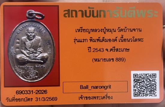 เคาะแรกแดงครับ เหรียญหลวงปู่หมุน วัดบ้านจาน รุ่นแรก เนื้อนวโลหะ ปี 2543 **เลข 889 สวยหายากครับ เลขนี้