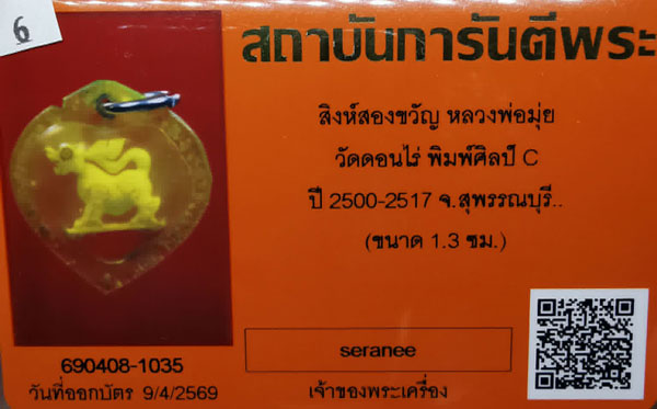 สิงห์สองขวัญ หลวงพ่อมุ่ย วัดดอนไร่ พิมพ์ศิลป์C ปี2500-2517 จ.สุพรรณบุรี(ขนาด1.3ซม.) + บัตรG-pra สภาพสวยเดิมค่ะ |