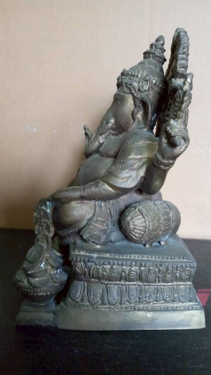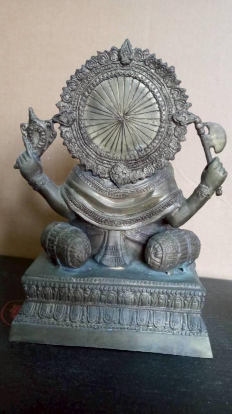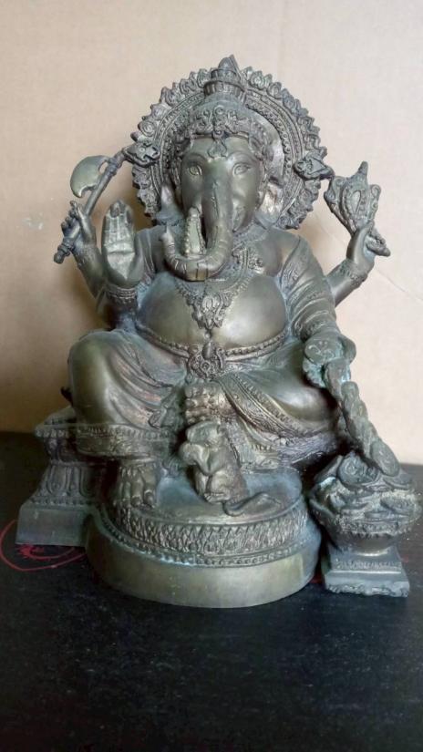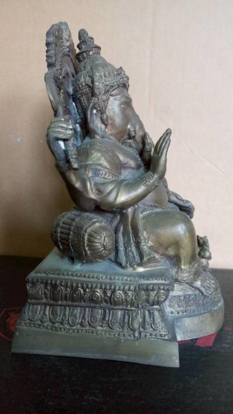 พระพิฆเณศ ชนาดบูชา หน้าตัก 5 นิ้ว ฐาน 6.8 นิ้ว X ุ6 นิ้ว สูง 9.8 นิ้ว เนื้อทองเหลิอง มีน้ำหนัก ผิวหิ้ง สวย