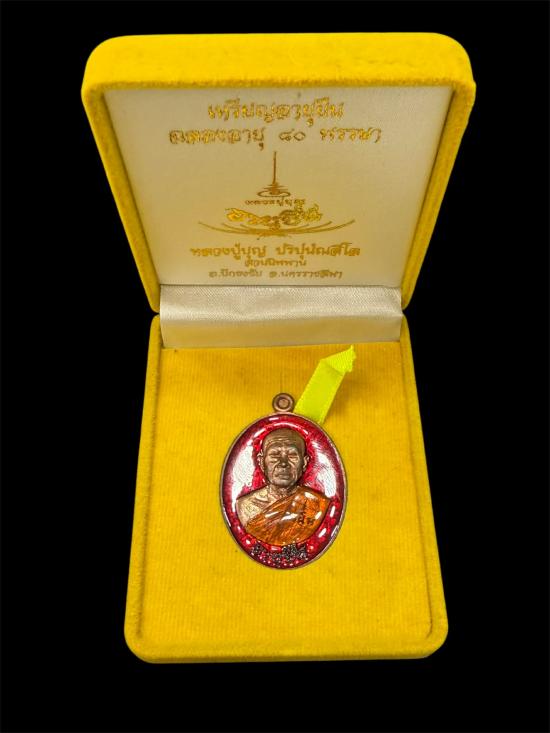 !!!!วัดใจ 9 บาท!!!!เหรียญอายุยืน ฉลองอายุ 80พรรษา เนื้อนวะโลหะลงยาแดง หลังเรียบ หมายเลข 10 หลวงปู่บุญ ปริปุนณสีโล วัดปอแดง(สวนนิพพาน) จ.นครราชสีมา พร้อมกล่องเดิม.....................A512