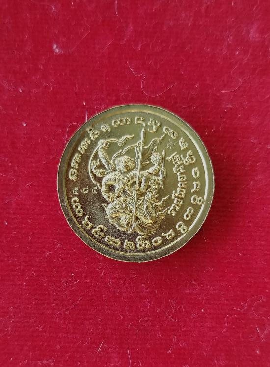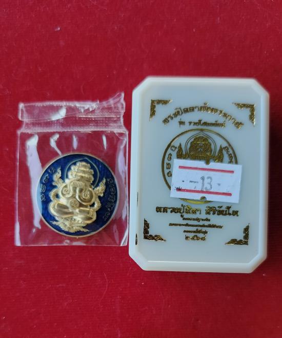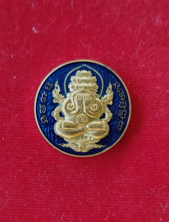 เหรียญพระปิดตาพังพระกาฬ หลังพหุรมาน หลวงปู่มหาศิลา สิริจันโท รุ่นรวยโชคอนันต์ เนื้อทองฝาบาตร ลงยาน้ำเงิน no.585 เลขหาม แยกจากชุดกรรมการลงยา กล่องเดิม