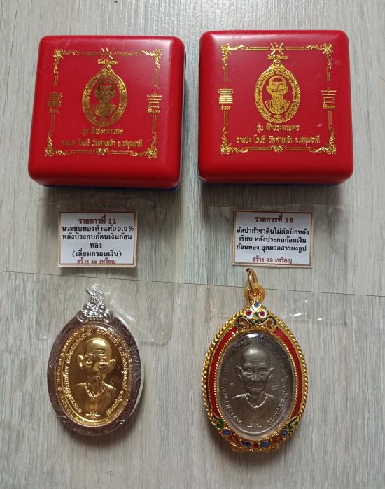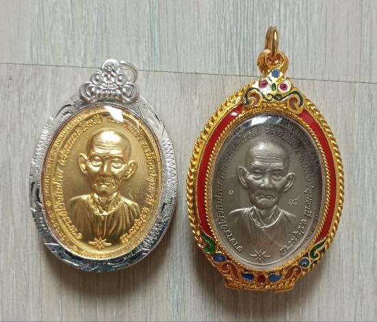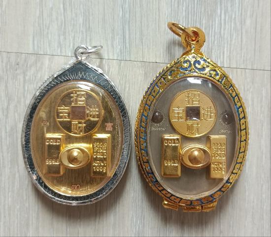 วัดใจเคาะเดียวแดงจ้า เหรียญแปะโรงสี ออกวัดศาลเจ้า เนื้อนวะชุบทองคำแท้+อัลปาก้าไม่ตัดปีก หลังแปะก้อนเงินก้อนทอง มวลสารผงธูป พร้อมกรอบ ทั้ง2องค์ เคาะเดียวแดงจ้า