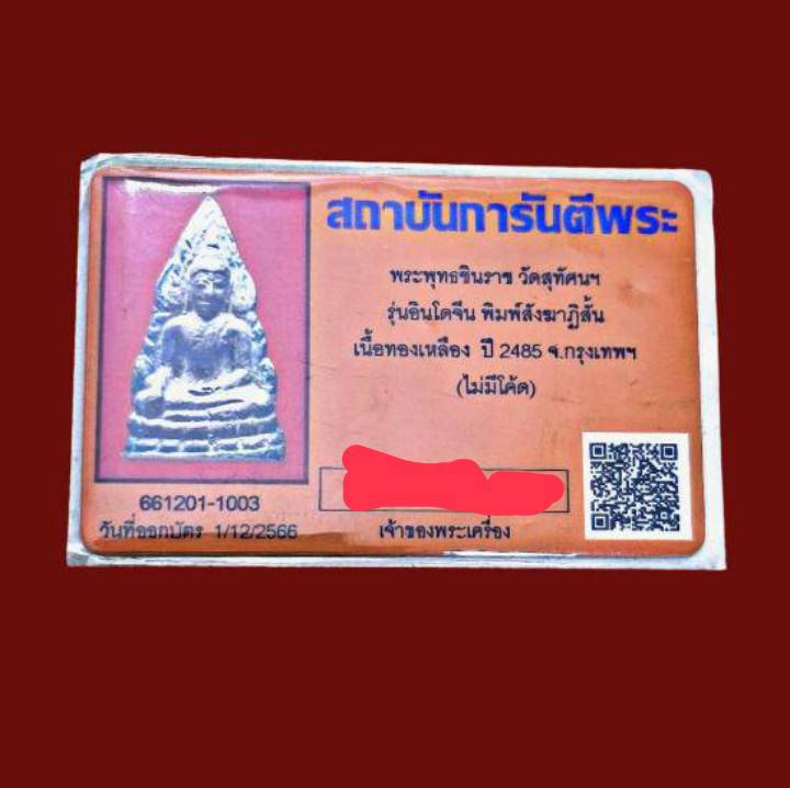 พระพุทธชินราชอินโดจีน สังฆาฏิสั้น ไม่มีโค๊ด วัดสุทัศน์ ปี2485 สภาพสวย ผิวเดิม มาพร้อมบัตรรับรอง รับประกันตามกฏทุกประการ
