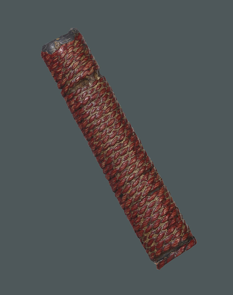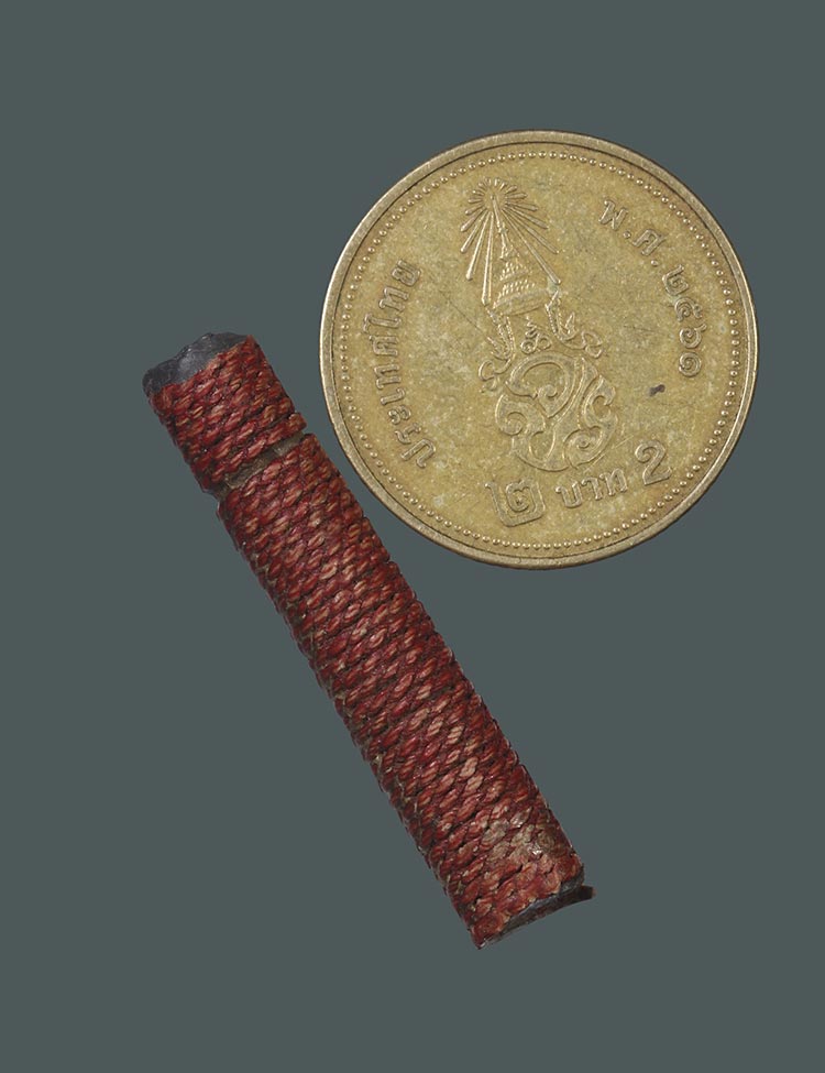 วัดใจ**เครื่องราง ตะกรุดสาริกา เนื้อตะกั่วถักเชือกป่านลงชาดแดง ยาว 1.3นิ้ว ไม่ทราบที่....ตามสภาพครับ |
