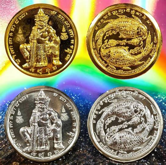 - เหรียญมหาโภคทรัพย์ ท้าวเวสสุวรรณ : ( รวย : เจริญ: ดี )