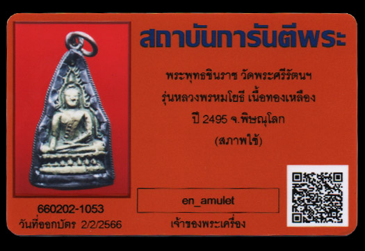 พระพุทธชินราช รุ่นหลวงพรหมโยธี ปี 2495 เนื้อทองเหลือง โค๊ดอกเลา วัดพระศรีฯ จังหวัดพิษณุโลก สภาพสมบูรณ์ พร้อมบัตร G-pra ครับ