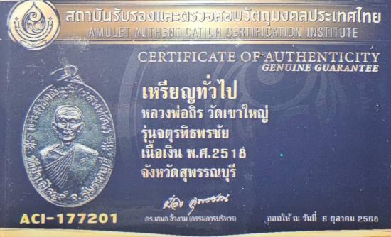 เหรียญจตุรพิธพรชัยหลวงพ่อถิร ปี 2518 ( เนื้อเงิน ) พร้อมบัตรรับรองสถาบันตรวจสอบวัตถุมงคลแห่งประเทศไทย