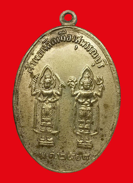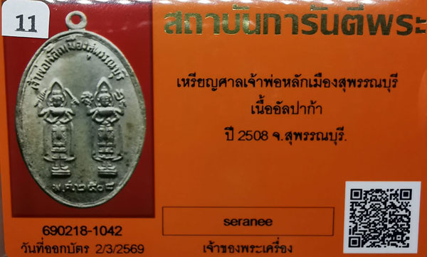 เหรียญเจ้าพ่อหลักเมืองสุพรรณบุรี เนื้ออัลปาก้า ปี2508 จ.สุพรรณบุรี + บัตรG-pra สภาพเดิมค่ะ