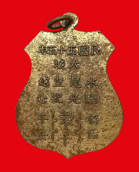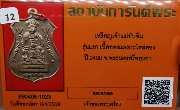 เหรียญเจ้าแม่ทับทิม รุ่นแรก เนื้อทองแดงกะไหล่ทอง ห่วงเดิม ปี2490 จ.พระนครศรีอยุธยา + บัตรG-pra สภาพเดิมค่ะ