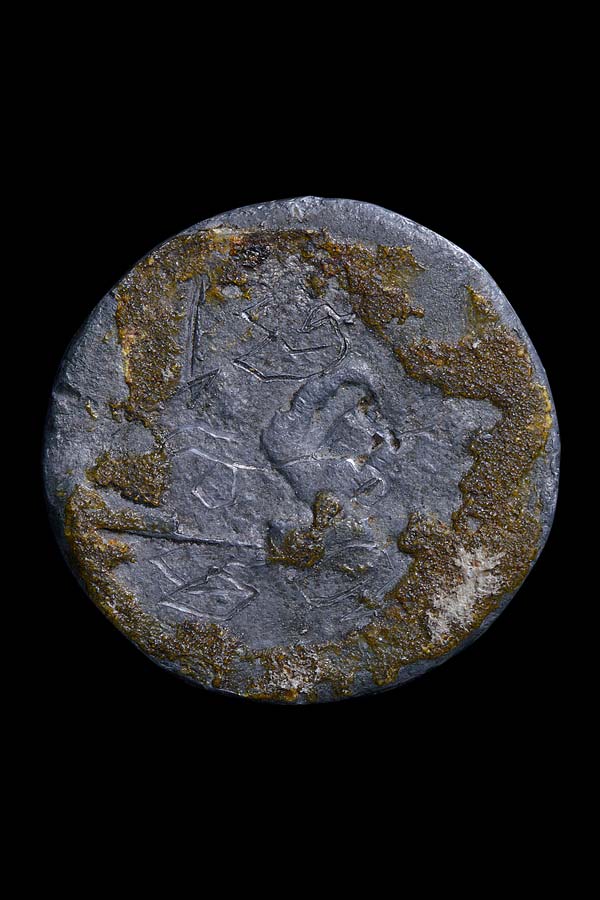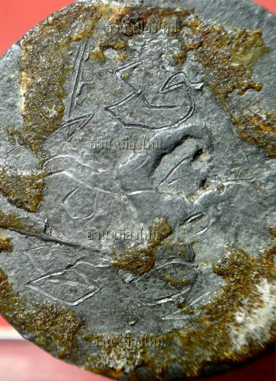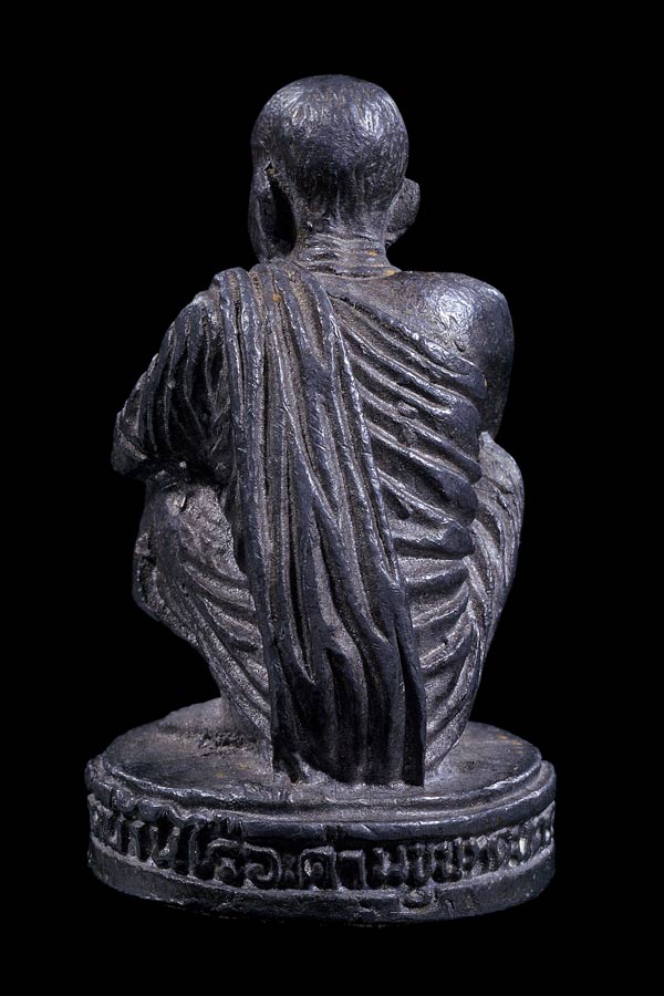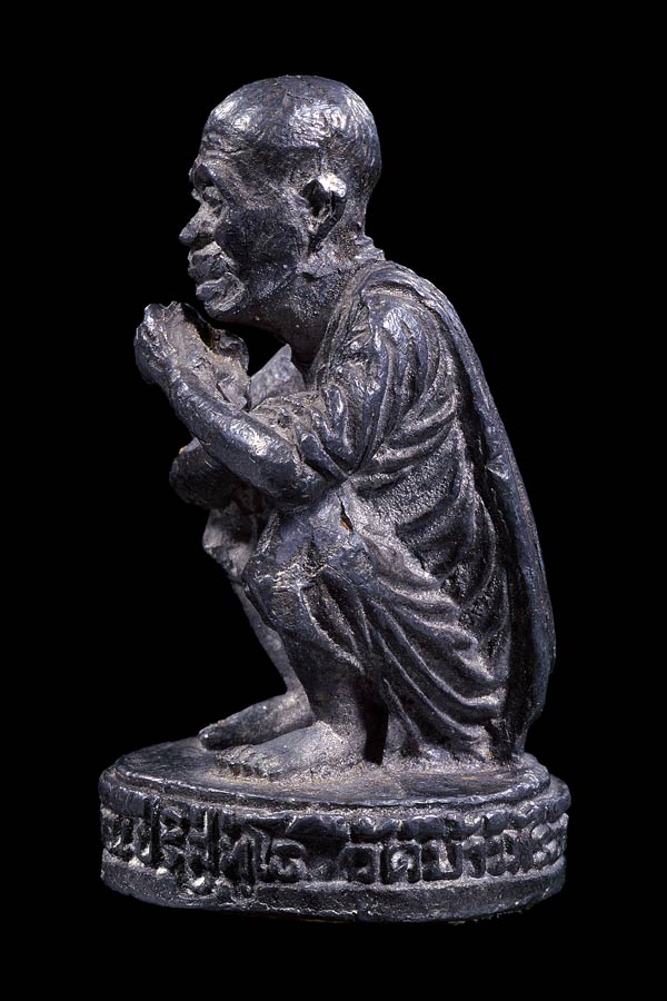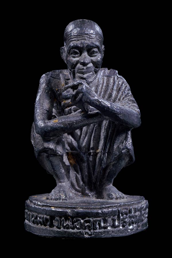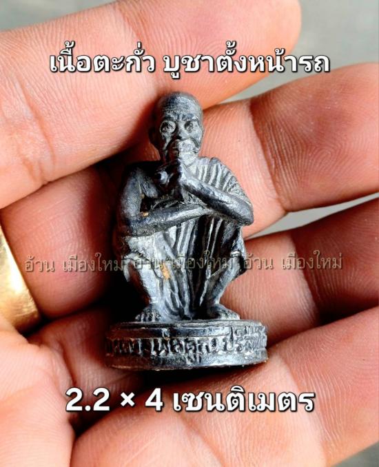 พระบูชาตั้งหน้ารถ ( 2.2 x 4 ซม. ) รูปเหมือนนั่งยอง ( เนื้อตะถั่ว ) ไม่ทราบปี ( มีจารใต้ฐาน , มีคราบกาวเก่า )