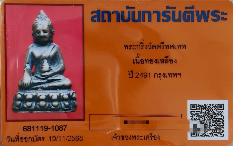 พระกริ่งวัดตรีทศเทพ เนื้อทองเหลือง ปี 2491 กรุงเทพฯ +บัตรรับรอง