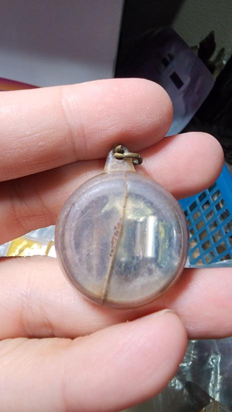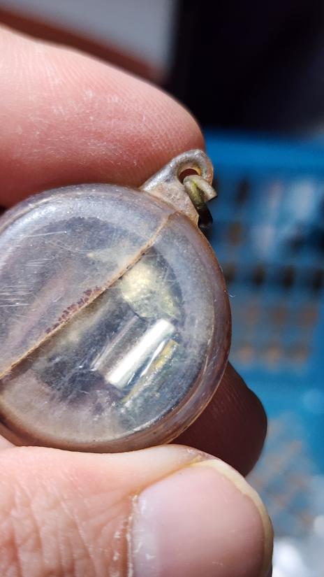 ตลับสีผึ้งเก่า ด้านในมีตะกรุดและปลาตะเพียนทองเงิน ไม่ทราบที่