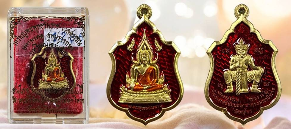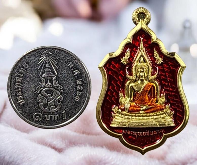 เหรียญโล่ห์พระพุทธชินราช หลังยันต์วิเศษอกเลาโภคทรัพย์ เนื้อทองทิพย์ลงยาสีแดง รุ่น สมโภชพระพุทธชินราช ครบ ๖๖๖ ปี