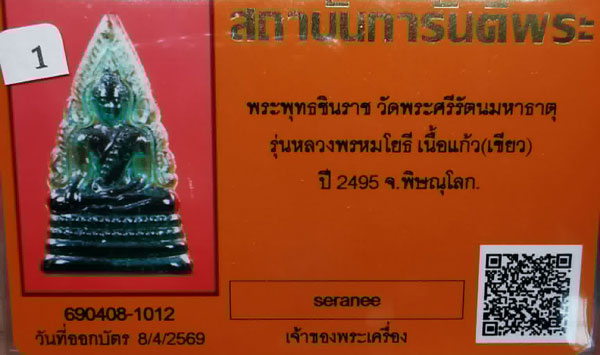 พระพุทธชินราช วัดพระศรีรัตนฯ รุ่นหลวงพรหมโยธี เนื้อแก้ว(เขียว) ปี2495 จ.พิษณุโลก + บัตร G-pra สภาพสวยเดิมค่ะ