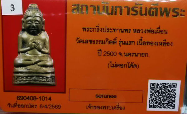 พระกริ่งประธานพร หลวงพ่อเผื่อน วัดเลขธรรมกิตติ์ รุ่นแรก เนื้อทองเหลือง กริ่งดัง ปี2500 จ.นครนายก(ไม่ตอกโค้ด) + บัตรG-pra สภาพเดิมค่ะ