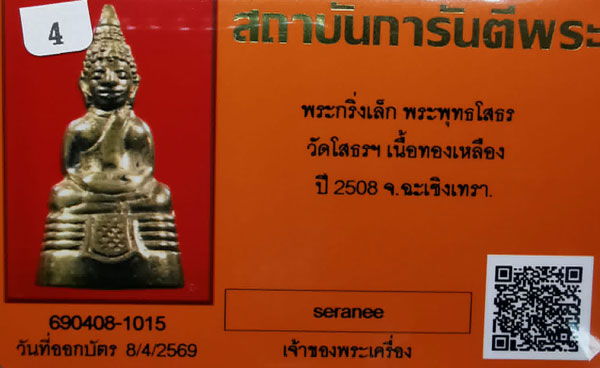 พระกริ่งเล็กพระพุทธโสธร วัดโสธรฯ เนื้อทองเหลือง กริ่งดัง ก้นกลึง ปี2508 จ.ฉะเชิงเทรา + บัตรG-pra สภาพเดิมค่ะ