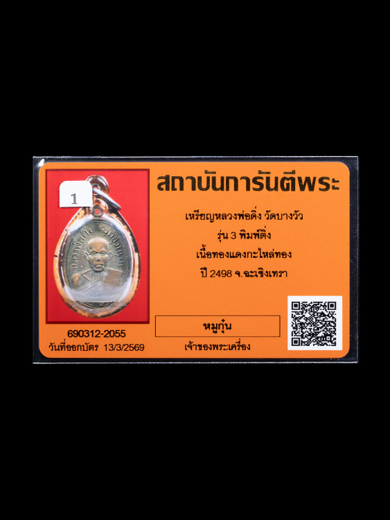 เหรียญหลวงพ่อดิ่ง วัดบางวัว รุ่น3 พิมพ์ติ่ง เนื้อทองแดงกะไหล่ทอง ปี2498 จ.ฉะเชิงเทรา พร้อมบัตรG...